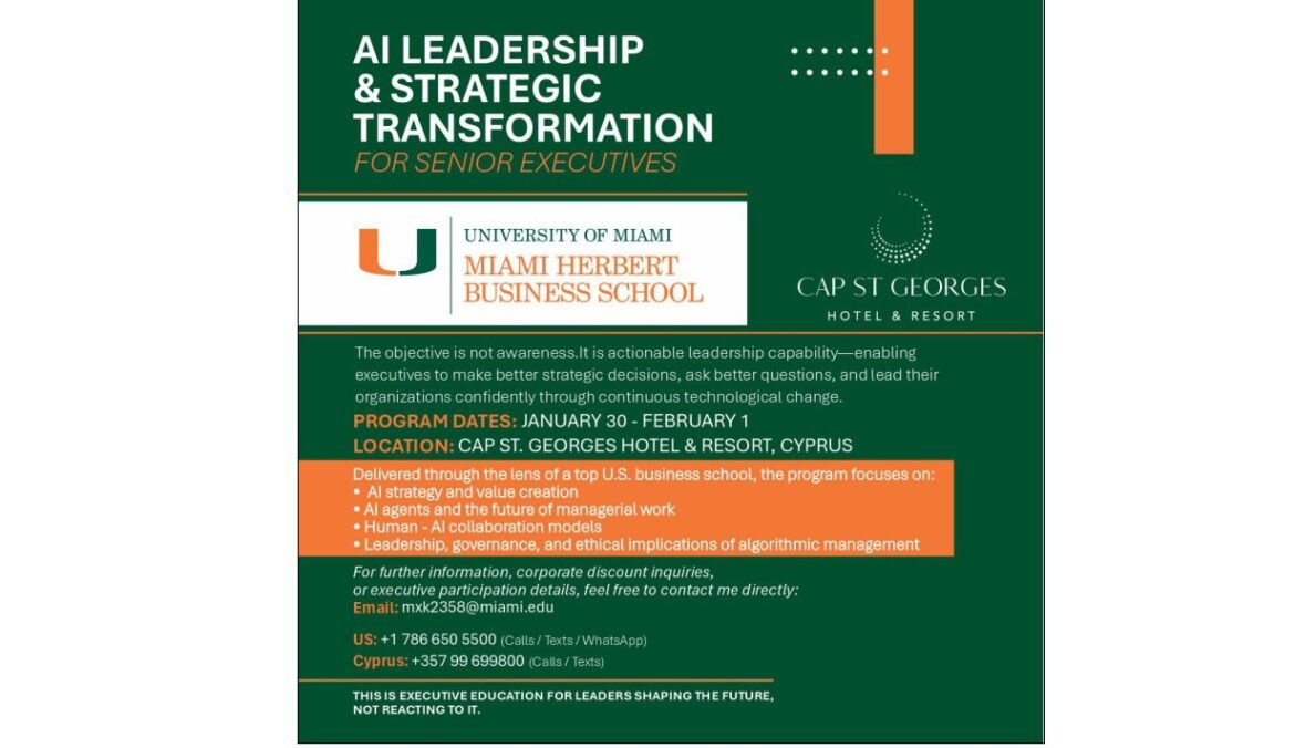 Η Κύπρος και η Πάφος φιλοξενούν ένα υψηλού επιπέδου διεθνές εκπαιδευτικό πρόγραμμα, για ανώτατα στελέχη επιχειρήσεων, με θέμα AI Leadership & Strategic Transformation for Senior Executives, που θα πραγματοποιηθεί στο Cap St Georges Hotel & Resort από τις 30 Ιανουαρίου έως την 1η Φεβρουαρίου 2026.