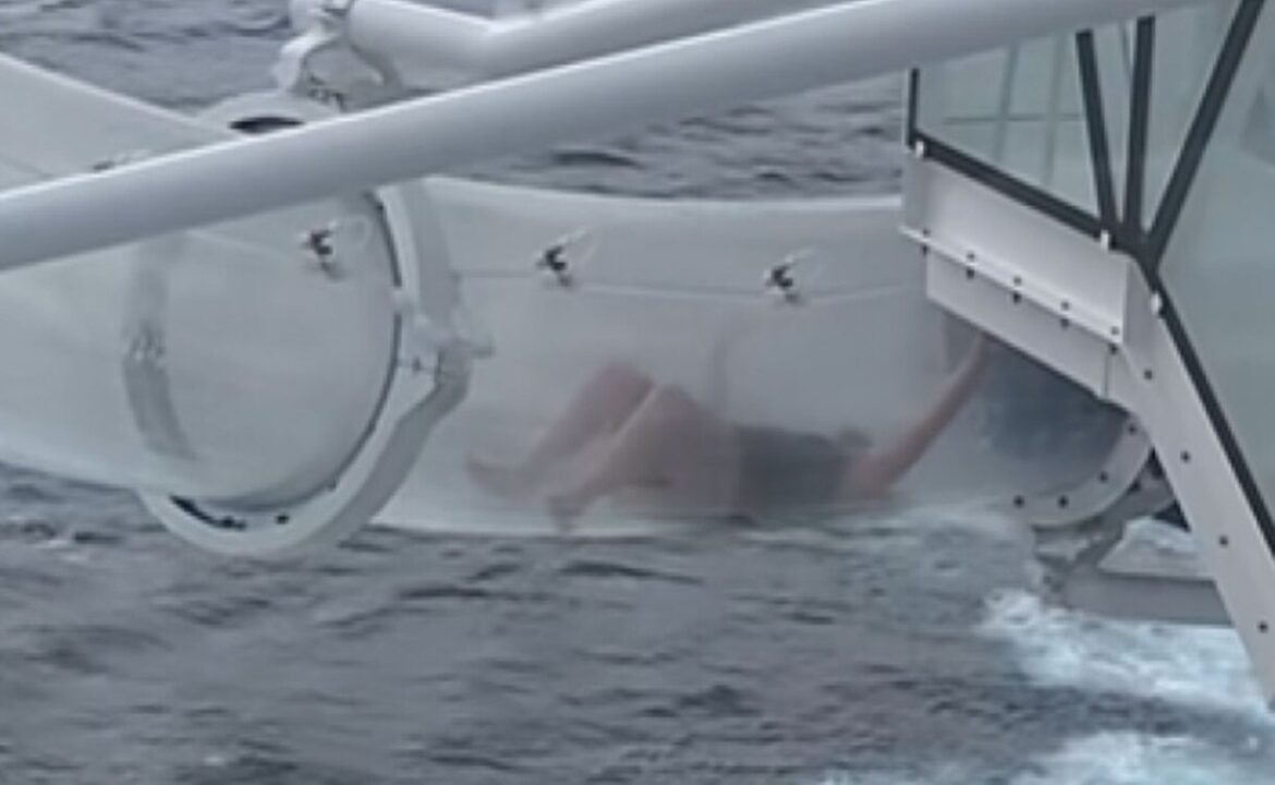 Στιγμές τρόμου έζησε επιβάτης κρουαζιερόπλοιου όταν παγιδεύτηκε μέσα σε νεροτσουλήθρα σε ύψος 30 μέτρων πάνω από την επιφάνεια της θάλασσας, όπως φαίνεται σε βίντεο που έγινε viral στο TikTok.