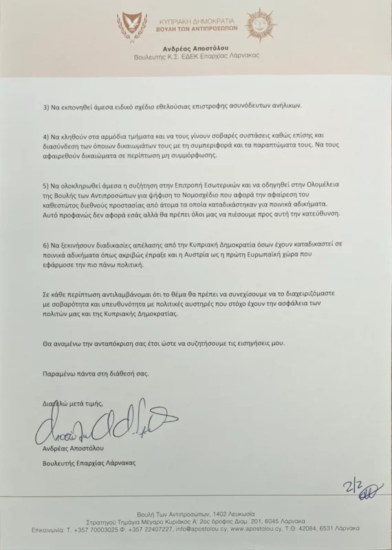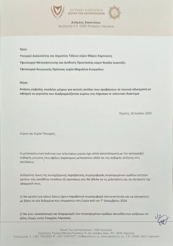 Έξι εφαρμόσιμες εισήγησης προς αρμόδιους Υπουργούς με στόχο την απέλαση αιτητών ασύλου που προβαίνουν σε ποινικά αδικήματα – Τι αναφέρει σε επιστολή του ο Βουλευτής Ανδρέας Αποστόλου