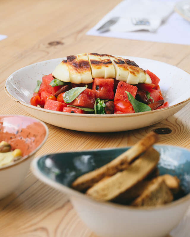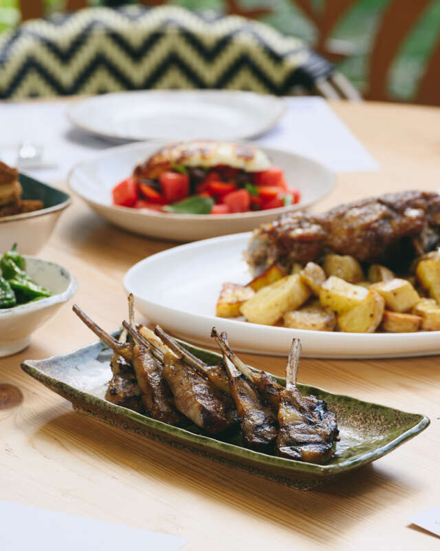 Τα κυρίως εμπνέονται από παραδοσιακές συνταγές, αλλά επαναπροσδιορίζονται: αρνί σιγομαγειρεμένο, λαβράκι σε ζεστή σαλάτα με λουβί ή χοιρινή μπριζόλα σε μαρινάδα κόκκινου κρασιού. Το γλυκό φινάλε φέρνει μαζί του αρώματα από Ελλάδα – με τη γαλατόπιτα να μας θυμίζει τις κουζίνες της Αρκαδίας.