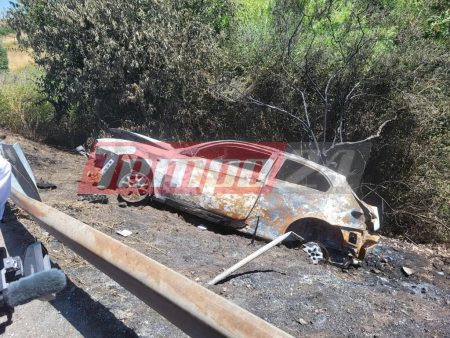 Ειδικότερα, 22χρονος ημεδαπός άνδρας οδηγώντας αυτοκίνητο, με συνεπιβάτιδα μια 16χρονη, εξετράπη της πορείας του και συγκρούστηκε πλαγιομετωπικά με ιδιωτικής χρήσεως φορτηγό, που οδηγούσε άνδρας με συνεπιβάτιδα μια γυναίκα, ενώ στην συνέχεια προσέκρουσε σε προστατευτικές μεταλλικές μπάρες και ανετράπη, με αποτέλεσμα να εκδηλωθεί φωτιά στο όχημα του 22χρονου.