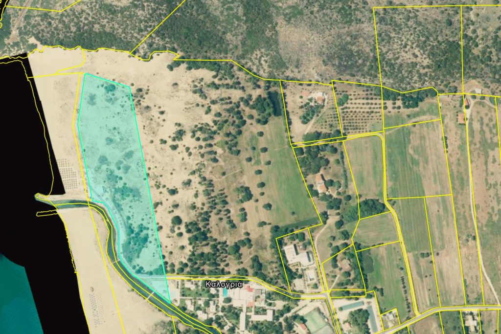 Η επίμαχη περιοχή των 35 στρεμμάτων στην παραλία της Καλογριάς, αποτυπωμένη με κυανή επισήμανση. Η έκταση βρίσκεται αποτελεί αντικείμενο διαμάχης μεταξύ ενός ιδιώτη και του Δημοσίου, με φόντο παλιούς τίτλους και νεότερες διοικητικές πράξεις.