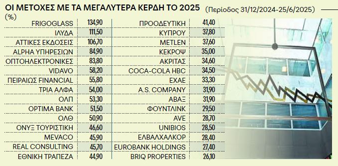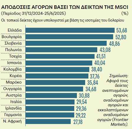 Οι ελληνικές μετοχές κερδίζουν εξάλλου φέτος 25 δισ. ευρώ από την αρχή του έτους, ενώ ο Γενικός Δείκτης τουελληνικού Χρηματιστηρίου, με κέρδη 28% περίπου το α’ εξάμηνο, βρίσκεται στην 3η θέση των αποδόσεων παγκοσμίως, πίσω από τις αγορές της Σλοβενίας (SBI Top: +33,99%) και της Κορέας (KOSPI Korea: +29,54%).