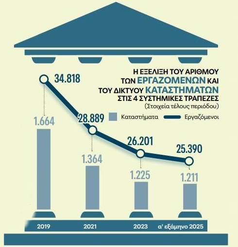 Κατά τη διάρκεια του α’ εξαμήνου 2025 μάλιστα, για πρώτη φορά μετά από χρόνια το ισοζύγιο προσλήψεων – αποχωρήσεων συνολικά στους 4 μεγάλους του κλάδου ήταν οριακά θετικό, με τον αριθμό των εργαζομένων να αυξάνεται κατά περίπου 130 άτομα. Σίγουρα, η εν εξελίξει εθελούσια έξοδος στην Πειραιώς που ολοκληρώνεται αύριο θα πιέσει τα σχετικά μεγέθη, ωστόσο φαίνεται ότι βαίνουμε σε φάση σταθεροποίησης των θέσεων εργασίας εγχωρίως στους σημαντικούς ομίλους, στη ζώνη των 25.000.