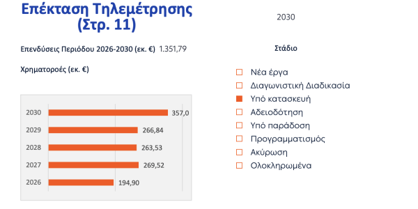 • Λοιπά έργα δικτύου με 25 επενδυτικά σχέδια ύψους 1,7 δισ. ευρώ. Τα 1,4 δισ. ευρώ κατευθύνονται στους έξυπνους μετρητές.