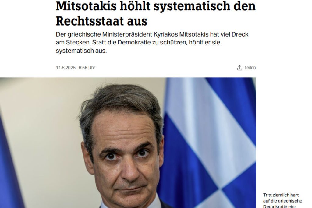 «Η γερμανική εφημερίδα ΤΑΖ περιγράφει τον Κ. Μητσοτάκη ως πρωθυπουργό που ‘έχει πολλή βρωμιά στα χέρια του’, υπογραμμίζοντας πως ‘υπονομεύει συστηματικά το κράτος δικαίου και τη δημοκρατία’», υπογράμμισε το κόμμα που ηγείται το Στέφανος Κασσελάκης.