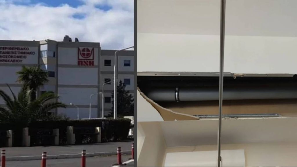 Σε μεγάλο κίνδυνο βρέθηκανασθενείς και εργαζόμενοι του Πανεπιστημιακού Νοσοκομείου Ηρακλείου (ΠΑΓΝΗ), τα ξημερώματα της Δευτέρας, όταν έσπασε αγωγός νερού, με αποτέλεσμα ολόκληρο τμήμα της ψευδοροφής να καταρρεύσει και τα νερά μαζί με τα κομμάτια της γυψοσανίδας να πέσουν πάνω σε κρεβάτι ασθενούς, τραυματίζοντάς τον στο κεφάλι.