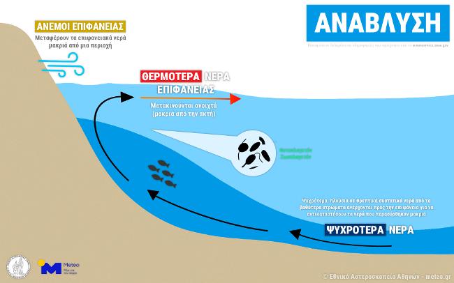 Ακόμα, στο Ιόνιο, οι τοπικά ισχυροί άνεμοι που πνέουν από την ξηρά προς τη θάλασσα ενισχύουν το φαινόμενο της ανάβλυσης (upwelling) ψυχρότερων υδάτων. Ειδικότερα, όταν φυσάει άνεμος πάνω από την επιφάνεια της θάλασσας, προκαλεί την κίνηση του νερού στην επιφάνεια. Ανάλογα με την ένταση και την κατεύθυνση του ανέμου, το επιφανειακό νερό κινείται απομακρυνόμενο απο την ακτή με αποτελέσμα το νερό από τα βαθύτερα στρώματα της θάλασσας να ανεβαινει προς την επιφάνεια. Το αποτέλεσμα είναι η εμφάνιση μίας ζώνης με ψυχρότερα επιφανειακά ύδατα κατά μήκος των ακτών του Ιονίου.