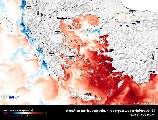 Μάλιστα, παραθέτει έναν χάρτη, στον οποίο παρουσιάζονται οι αποκλίσεις της θερμοκρασίας επιφάνειας της θάλασσας σε σχέση με τις κλιματικές τιμές της αντίστοιχης περιόδου. Σε αυτόν τον χάρτη φαίνεται ότι υπάρχουν πολύ θερμά νερά στο νοτιοανατολικό Αιγαίο, μια περιοχή που δεν επηρεάζεται από τους ισχυρούς ανέμους.