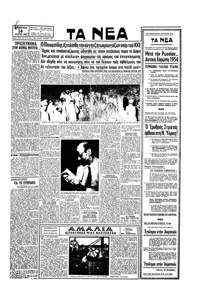 Tο πρωτοσέλιδο των «Νέων»: «Ο Πλουμπίδης εξετελέσθη την αυγήν ζητωκραυγάζων υπέρ του ΚΚΕ. Ωχρός και υποβασταζόμενος ωδηγήθη εις τόπον εκτελέσεως παρά το Δαφνί. Αντιμετώπισε με απόλυτον ψυχραιμίαν τας σφαίρας του αποσπάσματος. Δεν εδέχθη ούτε να κοινωνήση, ούτε να του δέσουν τους οφθαλμούς του. Αι τελευταίαι του λέξεις: “Αφίνω ένα τιμημένο όνομα στο παιδί μου”»