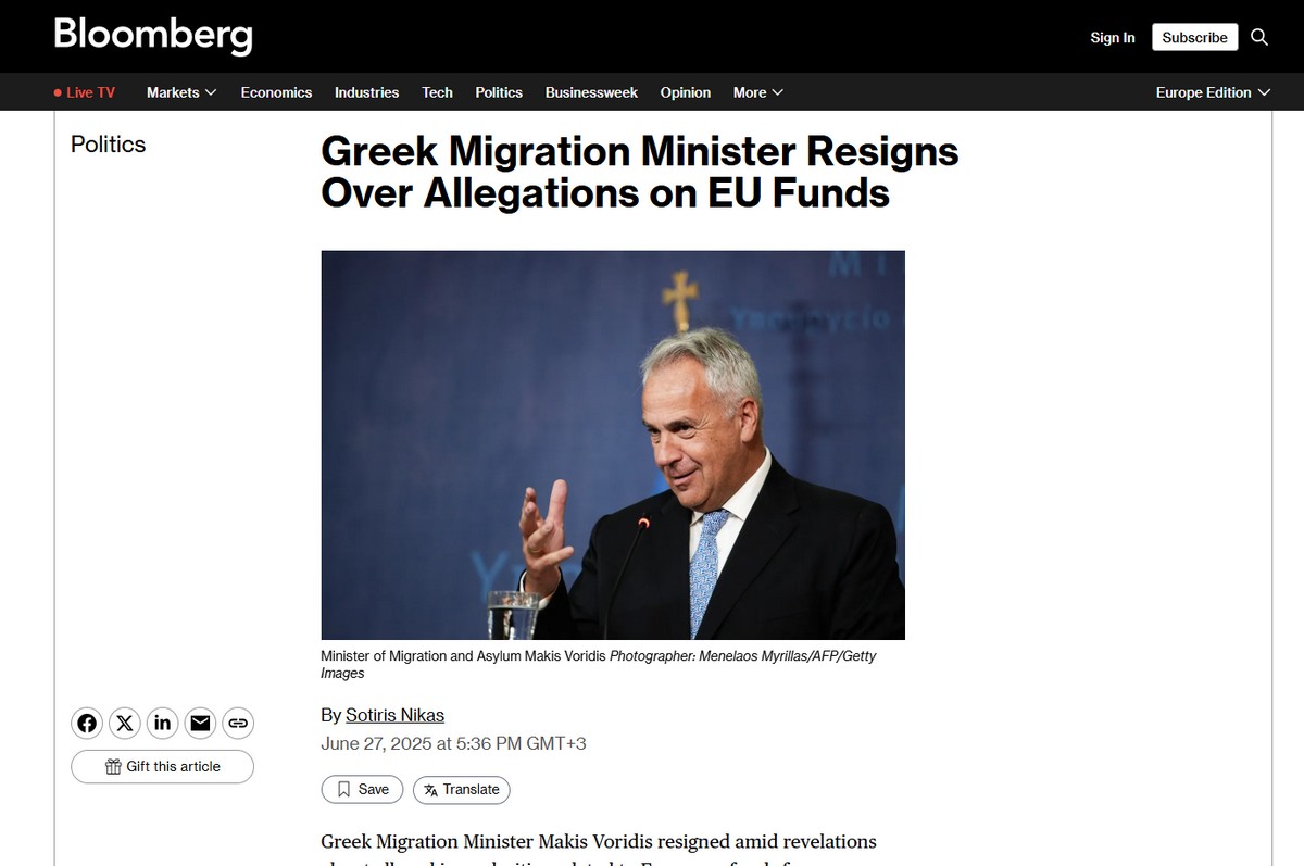 «Ο υπουργός Μετανάστευσης της Ελλάδας, Μάκης Βορίδης, παραιτήθηκε εν μέσω αποκαλύψεων για φερόμενες παρατυπίες σχετικά με τα ευρωπαϊκά κονδύλια για τη γεωργία» έγραψε το αμερικανικό Bloomberg.