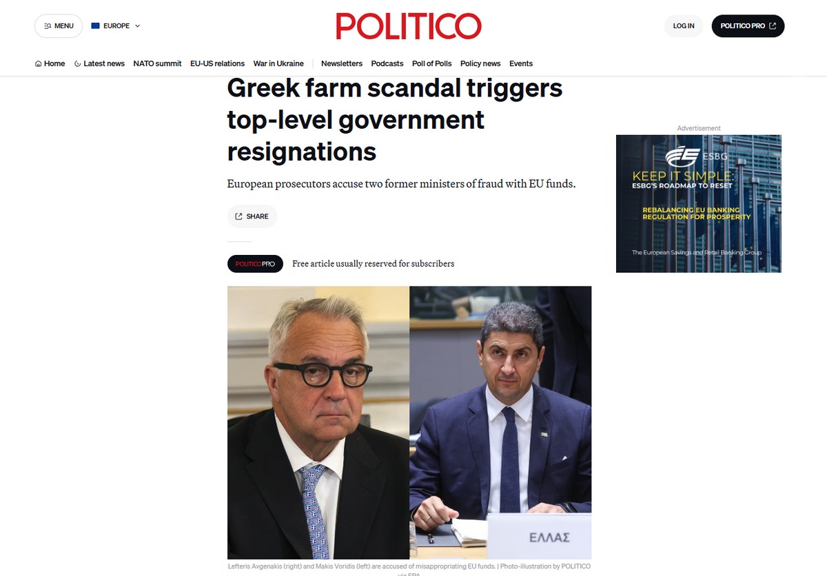 «Το σκάνδαλο της ελληνικής γεωργίας πυροδότησε παραιτήσεις στην ανώτατη κυβέρνηση» είναι ο τίτλος δημοσιεύματος του ευρωπαϊκού Politico, το οποίο εδώ και καιρό ασχολείται εις βάθος με το ζήτημα.