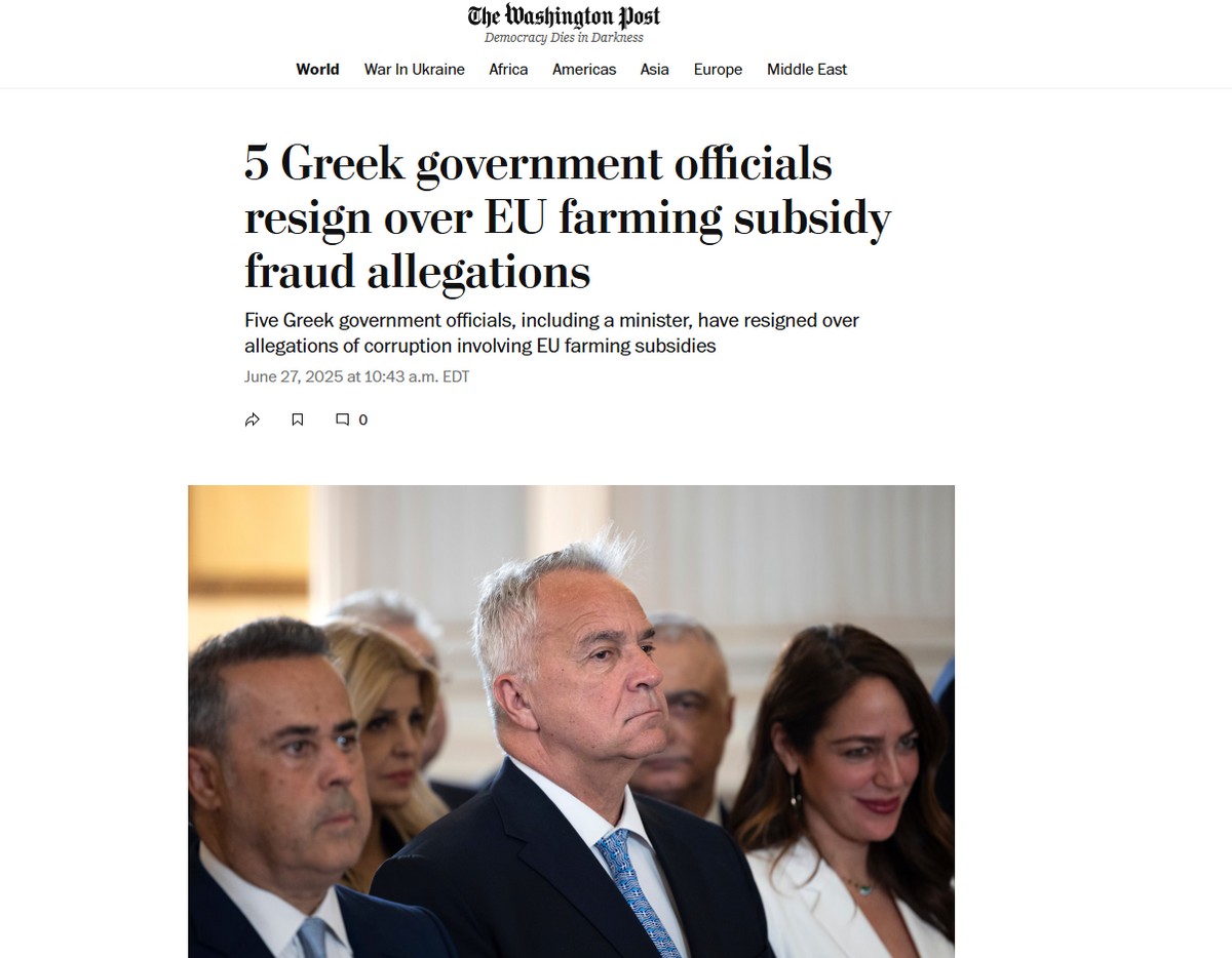 «Πέντε αξιωματούχοι της ελληνικής κυβέρνησης, συμπεριλαμβανομένου ενός υπουργού, παραιτήθηκαν μετά από καταγγελίες για διαφθορά που αφορούσαν αγροτικές επιδοτήσεις της ΕΕ» γράφει και η αμερικανική Washington Post, επικαλούμενη το πρακτορείο Associated Press.