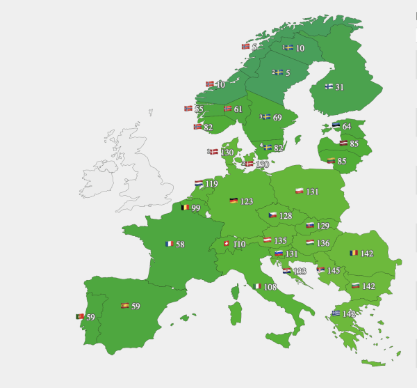 Σε Ρουμανία και Βουλγαρία οι τιμές είναι αυξημένες κατά 43% και διαμορφώνονται σχεδόν στα 142 ευρώ ανά Μεγαβατώρα, στη Σερβία καταγράφεται αύξηση 48% και τιμή στα 145 ευρώ ανά Μεγαβατώρα, στην Κροατία η μέση τιμή είναι υψηλότερη κατά 47% και κλείδωσε στα 133,21 ευρώ ανά Μεγαβατώρα, στην Ουγγαρία η τιμή αυξήθηκε κατά 36% και βρίσκεται στα 136,17 ευρώ ανά Μεγαβατώρα, στην Αυστρία η αύξηση είναι 55% και η τιμή εκτοξεύτηκε στα 134,77 ευρώ ανά Μεγαβατώρα, στη Γερμανία η τιμή είναι υψηλότερη κατά 37% και διαμορφώθηκε στα 122,72 ευρώ ανά Μεγαβατώρα, ενώ σε Λιθουανία και Λετονία σημειώνονται οι μεγαλύτερες αυξήσεις 131%.