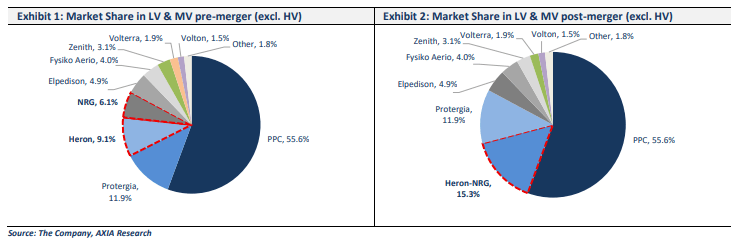 Επίσης, η συνδυασμένη οντότητα θα έχει μερίδιο αγοράς 17% στην ελληνική αγορά προμήθειας (ο 3ος μεγαλύτερος παίκτης σύμφωνα με τα στοιχεία του 2024), εξυπηρετώντας 488.000 πελάτες ηλεκτρικής ενέργειας, που αντιπροσωπεύουν συνολικές ετήσιες πωλήσεις 8,3 TWh, και 61.000 πελάτες φυσικού αερίου, με μερίδιο αγοράς 11%.