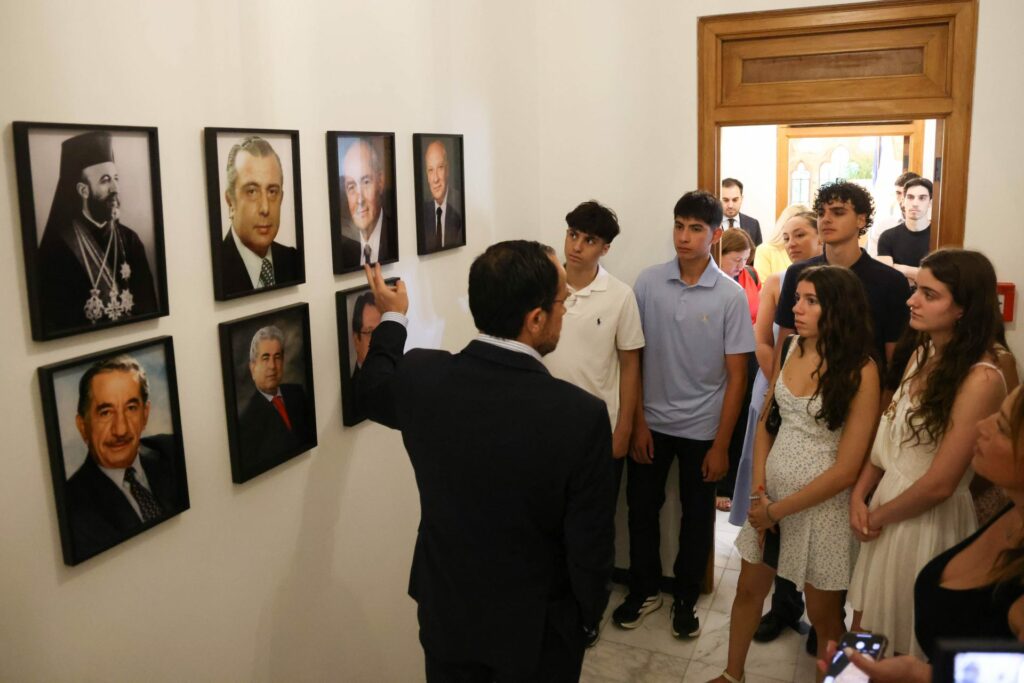 Ο Πρόεδρος Χριστοδουλίδης ξενάγησε την ομάδα στο γραφείο του, στην αίθουσα του Υπουργικού Συμβουλίου και στους ιστορικούς χώρους του Προεδρικού Μεγάρου, δείχνοντάς τους την πόρτα διαφυγής του Αρχιεπισκόπου Μακαρίου κατά το πραξικόπημα, καθώς και τα σημάδια από τις σφαίρες στην είσοδο. Επιπλέον, παρουσίασε τις φωτογραφίες των προηγούμενων Προέδρων της Δημοκρατίας και αναφέρθηκε συνοπτικά στο έργο και την πορεία καθενός.