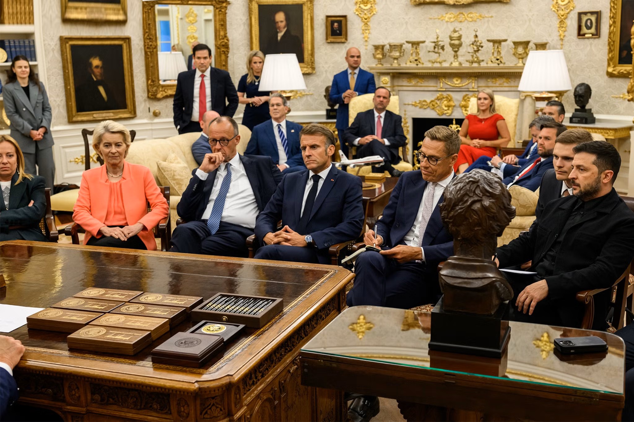 Ήταν η ΕΕ και το ΝΑΤΟ, αλλά όχι τα Ηνωμένα Έθνη. Κάποιοι υποστηρίζουν ότι η απουσία του ΟΗΕ έχει να κάνει με το ότι η Ρωσία είναι ένα από τα πέντε μόνιμα μέλη του Συμβουλίου Ασφαλείας, γεγονός που της επιτρέπει να χρησιμοποιεί το δικαίωμα του βέτο σε αποφάσεις με τις οποίες διαφωνεί. Είναι και αυτό, αλλά προσωπικά δεν πιστεύω ότι έπαιξε καθοριστικό ρόλο στην απόφαση του Τραμπ, από την ώρα που λίγα 24ωρα προηγουμένως είχε συνομιλίες με τον Ρώσο ομόλογό του, Βλαντίμιρ Πούτιν, στην Αλάσκα. Και τον οποίο είχε ενημερώσει για τις επόμενες κινήσεις του, ότι δηλαδή θα φώναζε στο Οβάλ Γραφείο Ζελένσκι, ΕΕ, ΝΑΤΟ και μερικούς ηγέτες από την Ευρώπη για τα περαιτέρω.