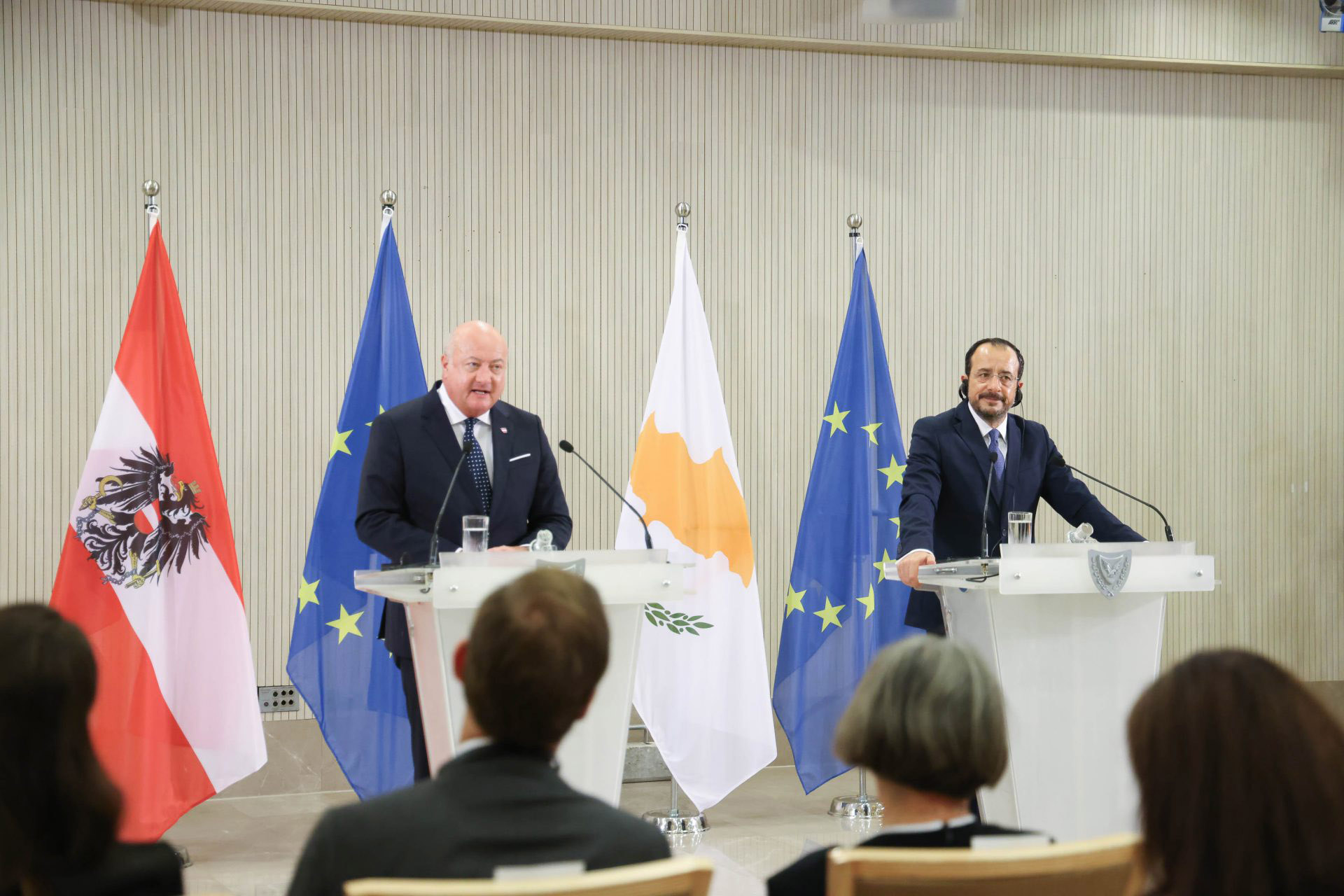 Η Αυστρία αποτελεί αξιόπιστο και πολύτιμο εταίρο εντός της Ευρωπαϊκής Ένωσης, με τον οποίο η Κύπρος έχει κοινές προσεγγίσεις, τόνισε ο Πρόεδρος Νίκος Χριστοδουλίδης, σε δηλώσεις του την Παρασκευή, στο Προεδρικό Μέγαρο, μαζί με τον Αυστριακό Καγκελάριο Κρίστιαν Στόκερ ο οποίος πραγματοποιεί επίσημη επίσκεψη.