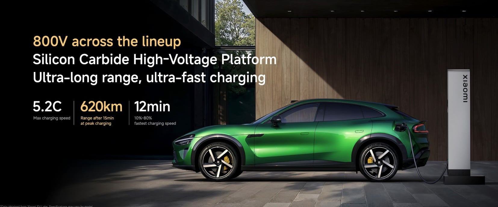 Οι εντυπωσιακές επιδόσεις μεγάλης εμβέλειας του Xiaomi YU7 καθίστανται δυνατές χάρη στην προηγμένη πλατφόρμα ηλεκτροκίνησης. Σε όλες τις εκδόσεις, το Xiaomi YU7 είναι εξοπλισμένο με μια πλατφόρμα καρβιδίου πυριτίου 800V. Υποστηρίζοντας εξαιρετικά γρήγορη φόρτιση σε έως και 5,2C, επιτυγχάνει φόρτιση 10-80% σε μόλις 12 λεπτά και μπορεί να φορτίσει έως και για 620 χιλιόμετρα σε 15 λεπτά.