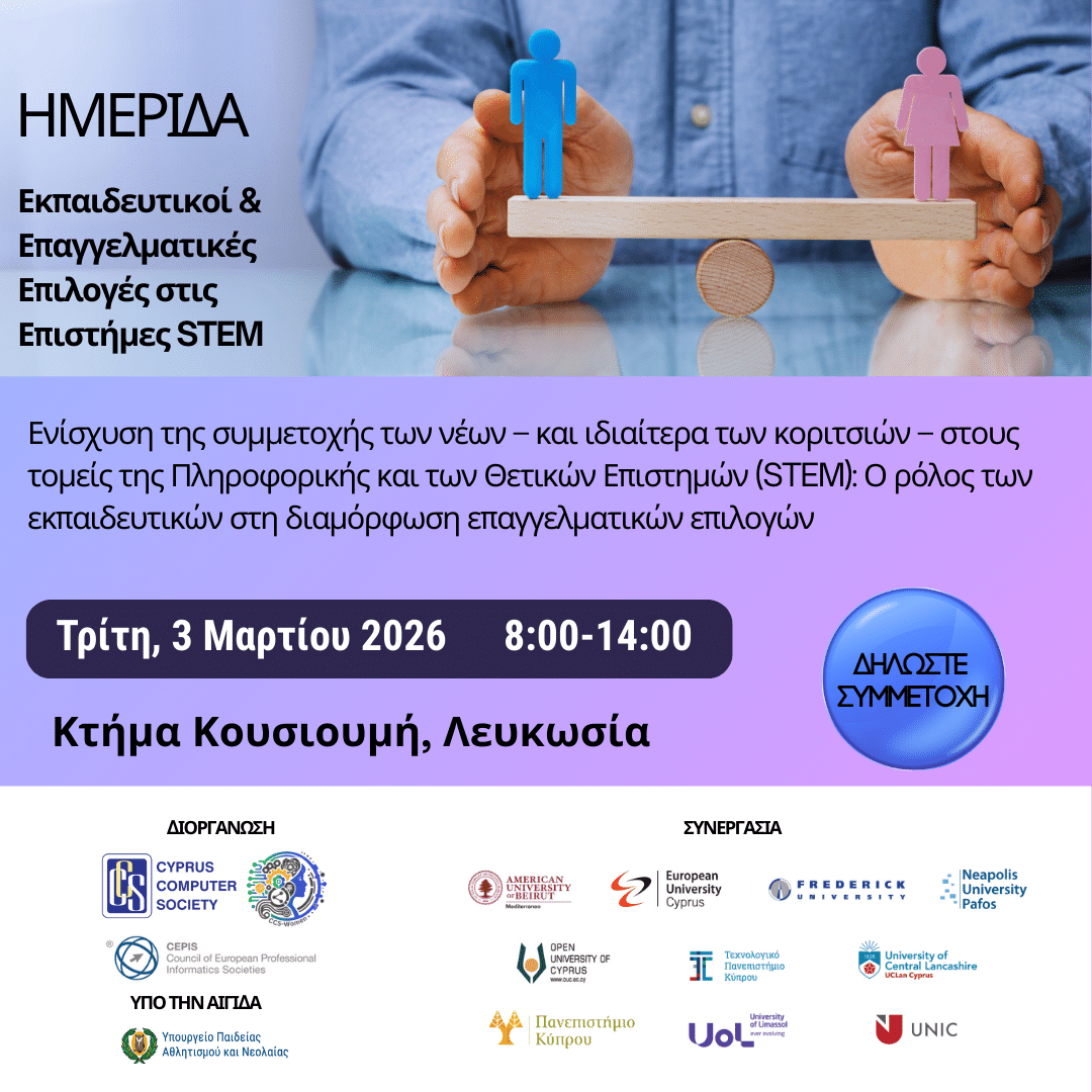 Ο Κυπριακός Σύνδεσμος Πληροφορικής και ο πανευρωπαϊκός οργανισμός Council of European Professional Informatics Societies (CEPIS), σε συνεργασία με δέκα δημόσια και ιδιωτικά πανεπιστήμια της Κύπρου, διοργανώνουν την Τρίτη 3 Μαρτίου 2026, στο Κτήμα Κουσιουμή στη Λευκωσία, από τις 09:00-13:00, ημερίδα με θέμα την ενίσχυση του επαγγελματικού προσανατολισμού των μαθητών και, ιδιαίτερα, των μαθητριών στους τομείς της Πληροφορικής, της Τεχνολογίας και των Θετικών Επιστημών (STEM).