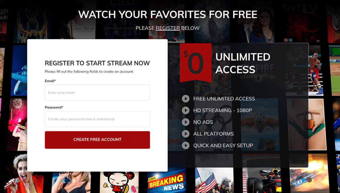 Παράδειγμα ιστότοπου και ψεύτικου player που ζητά από τους χρήστες να εγγραφούν για να συνεχίσουν την παρακολούθηση της ταινίας