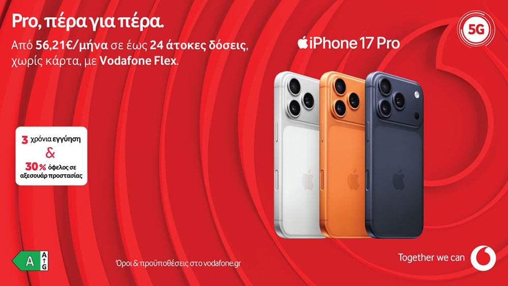 - iPhone 17 Pro: από 1.349€ ή από 56,21€/μήνα με Vodafone Flex