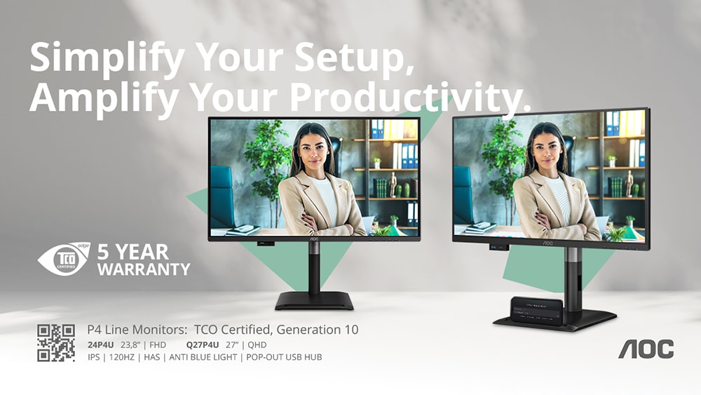Η AOC, ειδικός στις οθόνες, παρουσιάζει τη σειρά Professional P4, μια προσεκτικά διαμορφωμένη γκάμα business monitors ειδικά σχεδιασμένων για επαγγελματικά περιβάλλοντα. Η σειρά P4 ανταποκρίνεται στις εξελισσόμενες ανάγκες του σύγχρονου εργατικού δυναμικού με ρυθμούς ανανέωσης 120 Hz σε όλα τα μοντέλα, με έναν εύκολα προσβάσιμο αναδυόμενο διανομέα USB (hub) που περιλαμβάνει θύρα USB-C και τεχνολογία χαμηλού μπλε φωτός (hardware-based) πιστοποιημένη με TÜV Eye Comfort. Από τη μικρότερη σε διάσταση οθόνη 23,8 ιντσών (60,4 εκ.) Full HD 24P4U έως τη μεγαλύτερη 27 ιντσών (68,6 εκ.) QHD Q27P4U, κάθε μοντέλο προσφέρει επιδόσεις επαγγελματικού επιπέδου με τη συνδεσιμότητα που απαιτείται στους σύγχρονους χώρους εργασίας.
